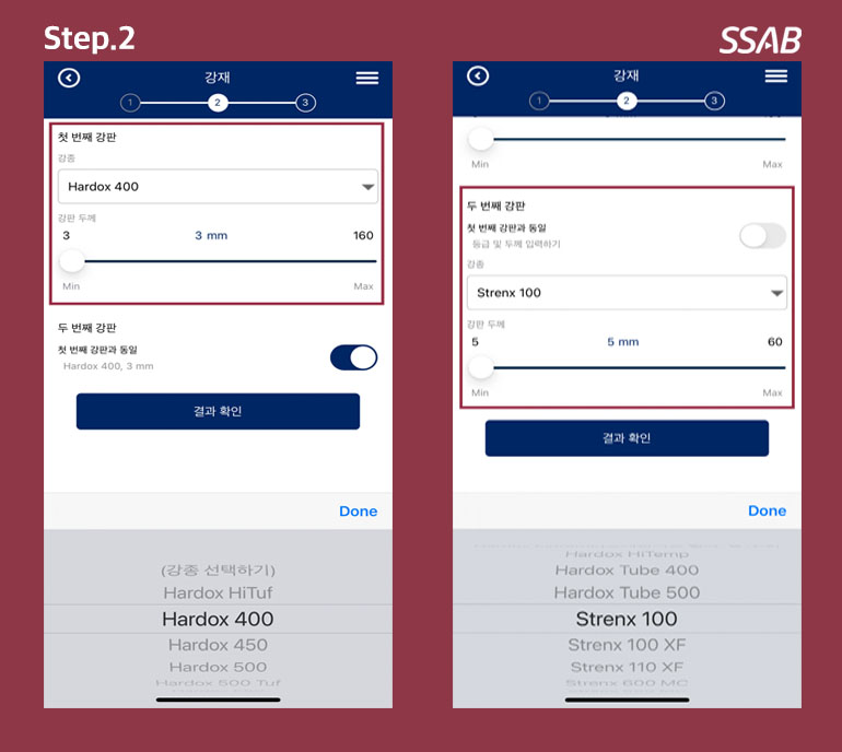 SSAB에서 개발한 Weldcalc에서는 현재 SSAB에서 제조.공급하고 있는 Hardox 및 Strenx제품군과 사용하고 있는 강재의 두께를 선정할 수 있어, (일부 data는 설정이 안될 수 있음을 알려드립니다.)