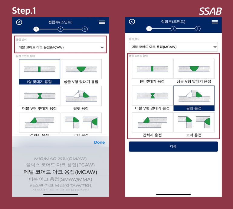 첫 번째 화면에서 나오는 용접방식과 용접조인트를 선택해줍니다. 첫 번째 화면에서 나오는 용접방식과 용접조인트를 선택해줍니다.