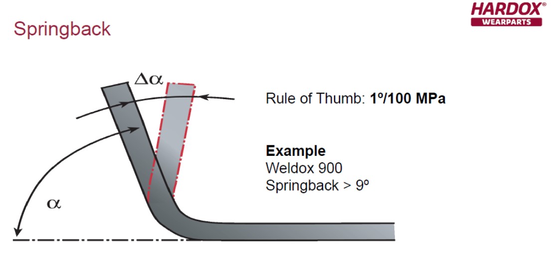 ③ 벤딩 후 스프링백(spring back)을 감안해야 하는데, 스프링백은 통상적으로 항복강도 100Mpa당 1°정도 발생하는 것으로 알려져 있습니다.
