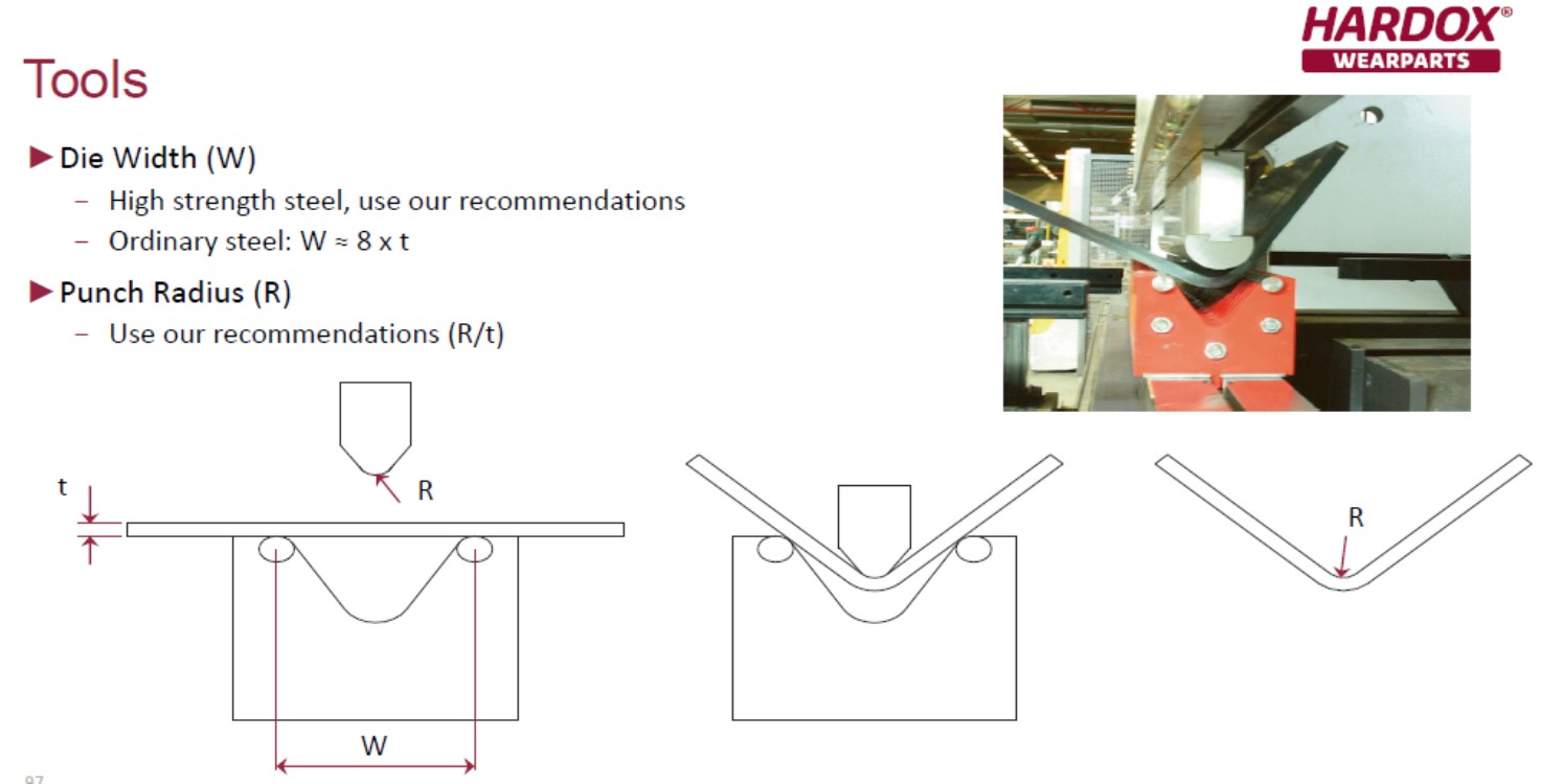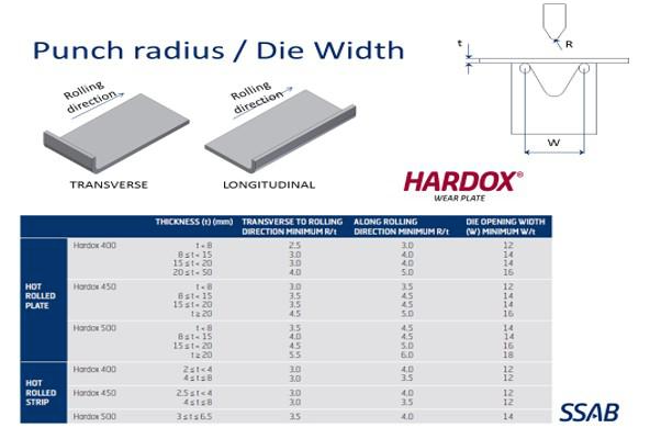 하독스는 일반 내마모강재보다 인성과 내균열성이 뛰어난 특징을 지니고 있을 뿐만 아니라 제품의 치수의 안정성을 기본으로 하여 벤딩 툴의 정확한 셋팅을 통해 일관된 절곡, 벤딩을 할 수 있습니다. 이는 SSAB Bendcalc를 이용하시면 보다 빠르게 효율적인 생산성을 가질 수 있습니다. Bendcalc로 Die width, Spring back 등 벤딩 가공 조건을 바로 잡아보세요.