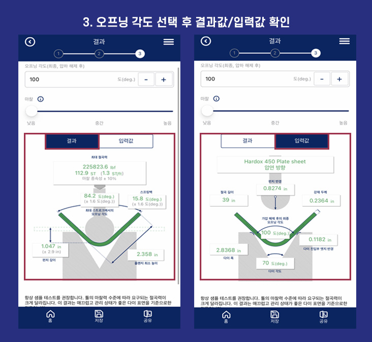 [STEP 3] 마지막으로, 오프닝 각도까지 입력해주면 벤딩 조건 설계가 마무리됩니다. 입력한 값들의 결과치는 같은 화면에서 확인할 수 있습니다.