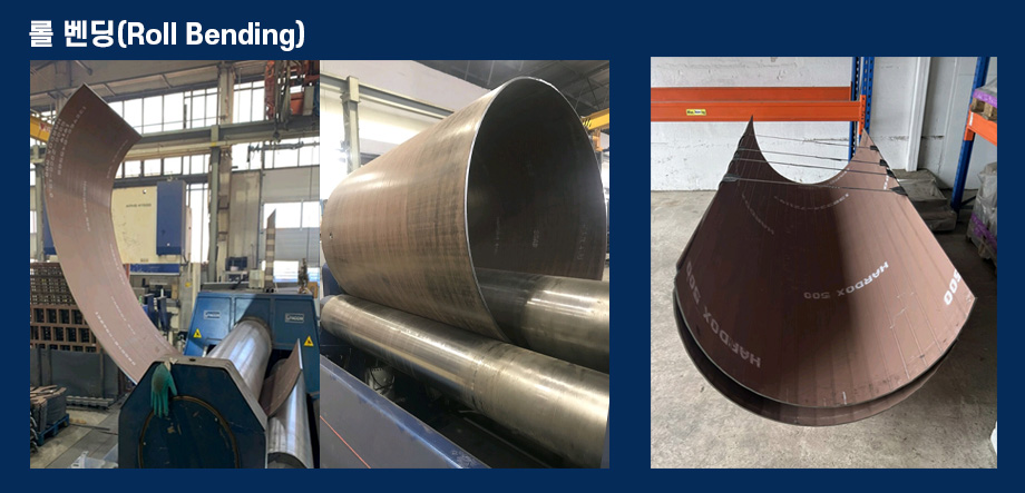 롤 벤딩은 균일한 두께의 시트를 압연해 내기 위하여 롤 양단에 외부로부터 힘을 가하여 철판을 구부리는 데 사용되죠.