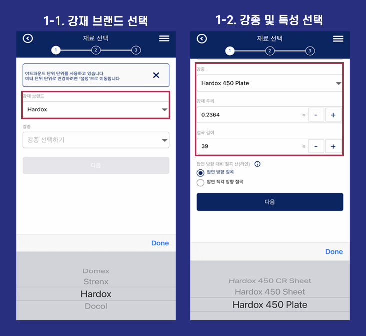 [STEP 1] 강재 브랜드와 함께 강종을 선택해줍니다. 강종을 선택하면, 이어서 강재의 두께와 절곡 길이를 조건에 맞게 설정해줍니다.