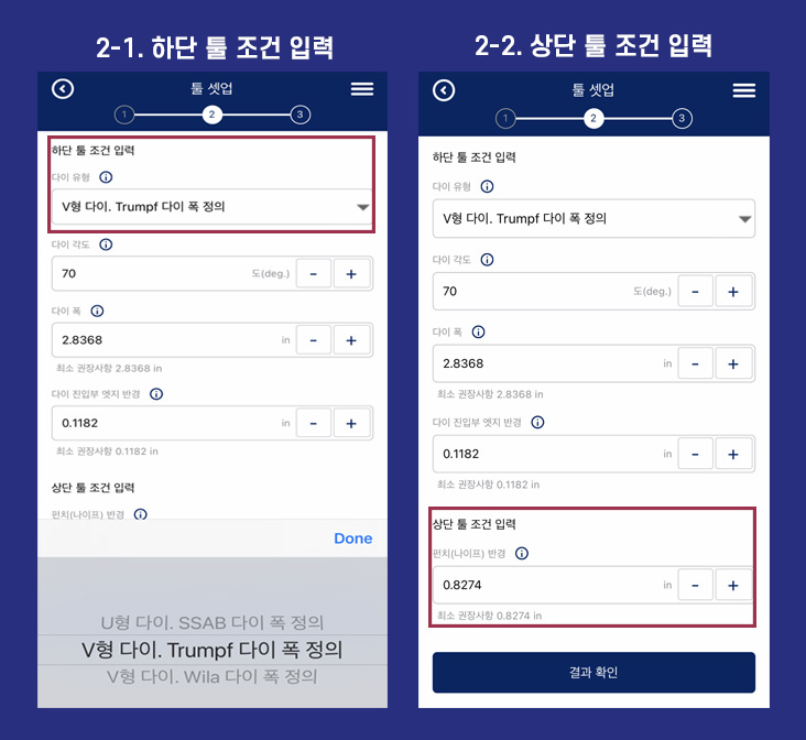 [STEP 2-1] 먼저, 하단 툴의 조건부터 입력해줍니다. 다이유형(U형 or V형)과 다이각도 및 폭, 다이 진입부의 엣지반경을 입력할 수 있습니다.