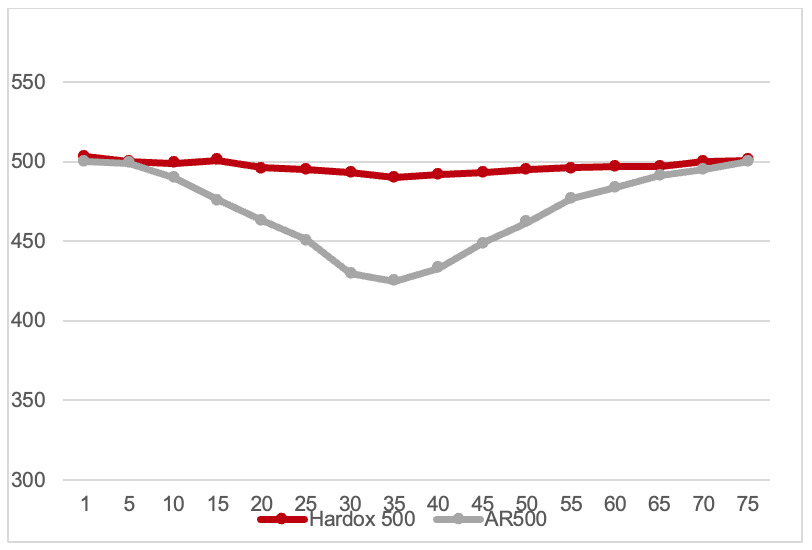 Hardox 500은 표면만 단단한 강판이 아닙니다. 두께 중심부까지 경도의 90% 이상을 유지해, 마모가 깊게 진행되어도 성능이 급격히 떨어지지 않습니다.